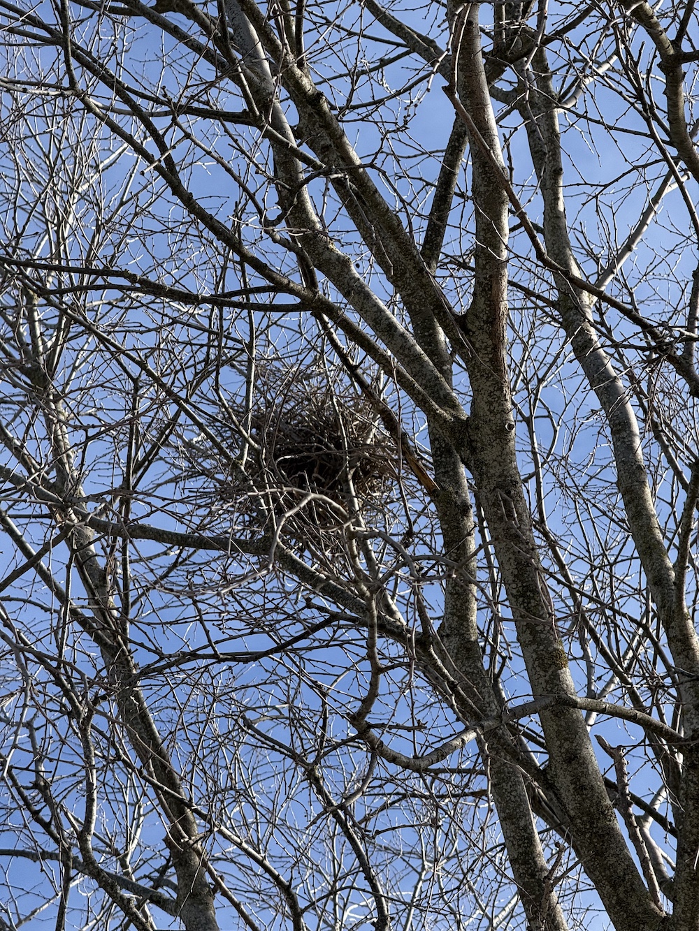 El niu, ara perfectament visible gràcies a l’absència de fulles, s’assenta en una bifurcació alta del lledoner. Al principi semblava una acumulació caòtica de branques, però amb els dies pren forma sobre una base sòlida, un contorn més definit, una cavitat central que aviat servirà de refugi. Una de les garses s’encarrega sobretot de portar material; l’altra, de col·locar-lo amb moviments precisos, ajustant les branques fins que queden encaixades.